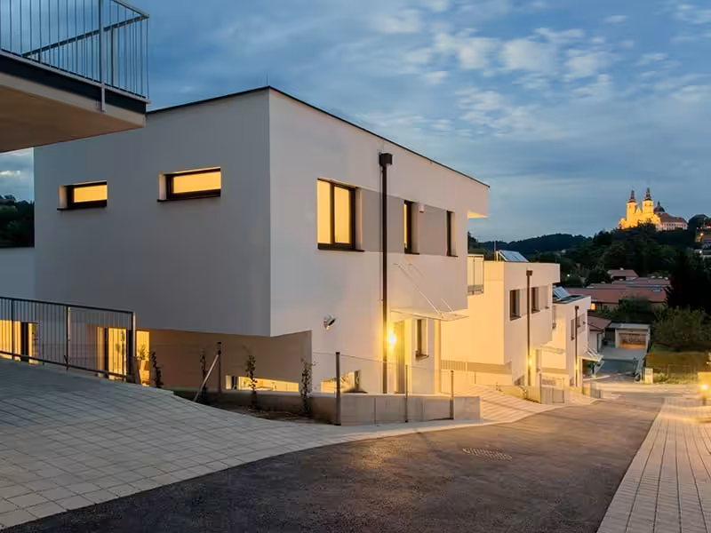 zweigeschossigen Einfamilienhäusern, nahe Mariatroster Basilika. Alle Häuser